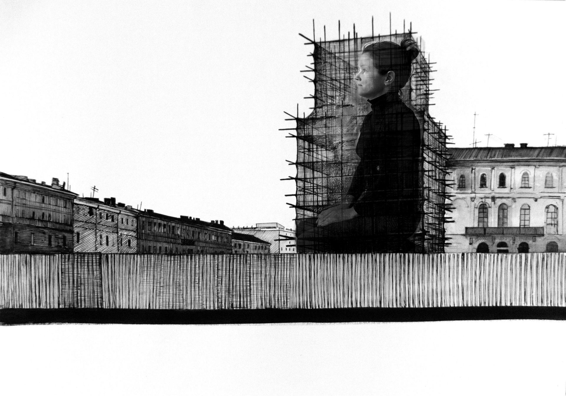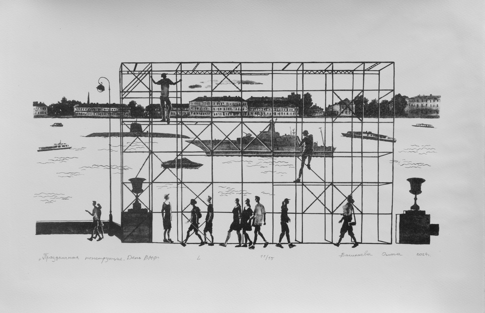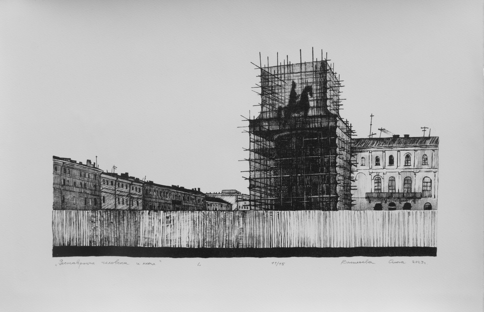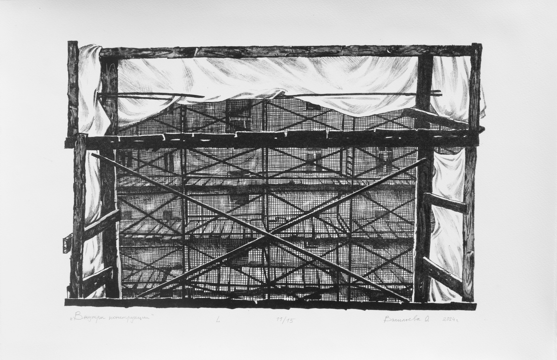 Временные конструкции — серия литографий, графических работ и видео, в которой исследуется, как в городской среде возникают и исчезают временные формы. Строительные леса, заборы, временные переходы и ограждения — объекты, мимо которых мы проходим, не задерживая взгляд. Они воспринимаются как визуальный шум, но именно в них фиксируются уязвимость города, его метаморфозы. Эти конструкции одновременно функциональны и случайны, они вмешиваются в привычный ландшафт, изменяют восприятие памятников, фасадов и пустых пространств.