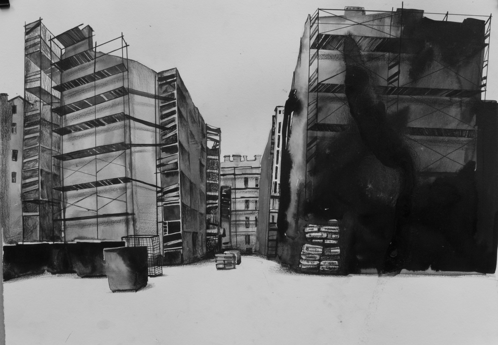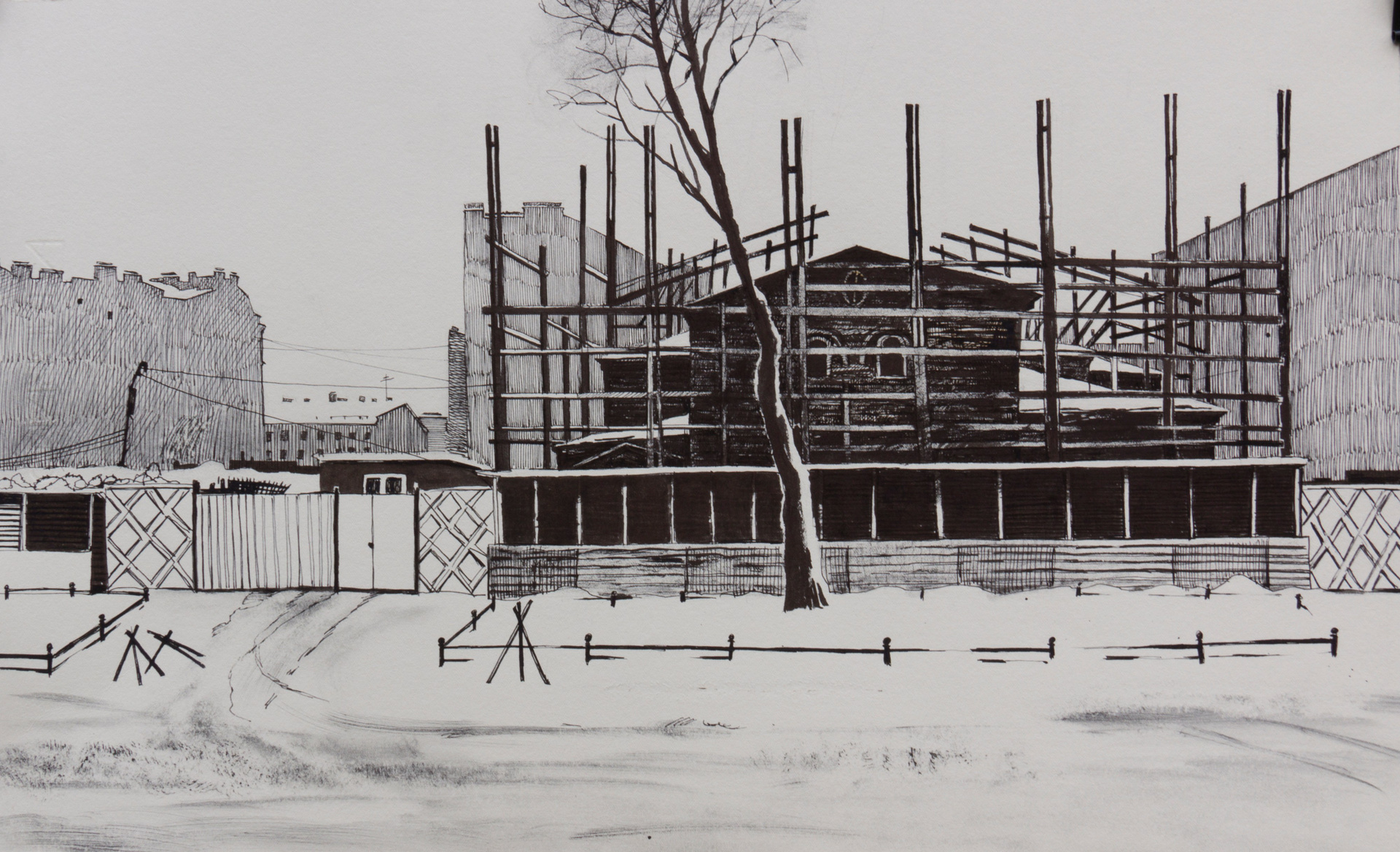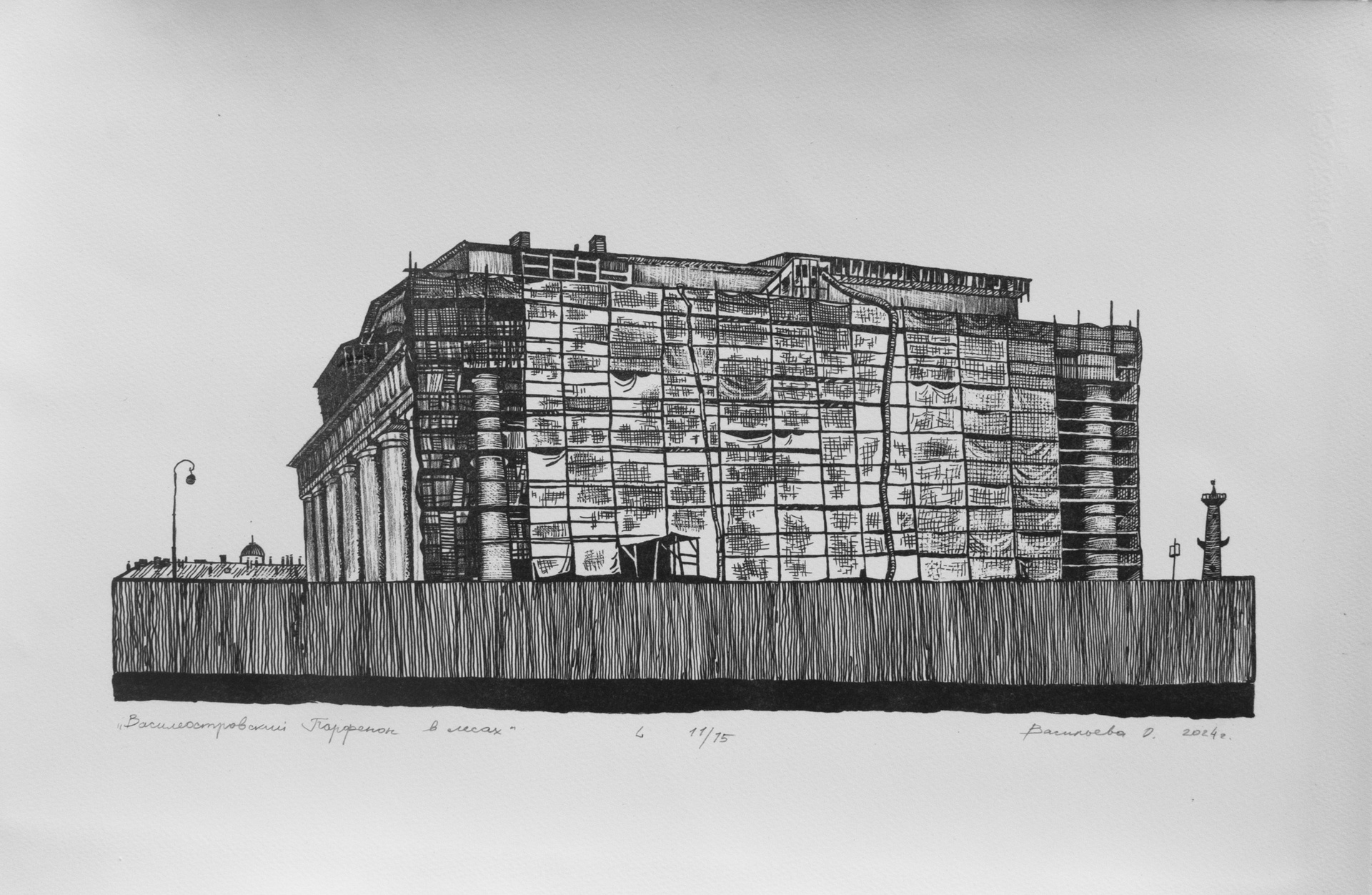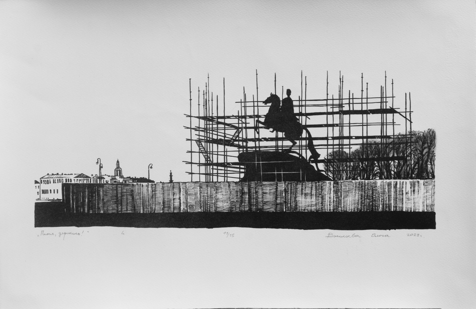 Временные конструкции — серия литографий, графических работ и видео, в которой исследуется, как в городской среде возникают и исчезают временные формы. Строительные леса, заборы, временные переходы и ограждения — объекты, мимо которых мы проходим, не задерживая взгляд. Они воспринимаются как визуальный шум, но именно в них фиксируются уязвимость города, его метаморфозы. Эти конструкции одновременно функциональны и случайны, они вмешиваются в привычный ландшафт, изменяют восприятие памятников, фасадов и пустых пространств.