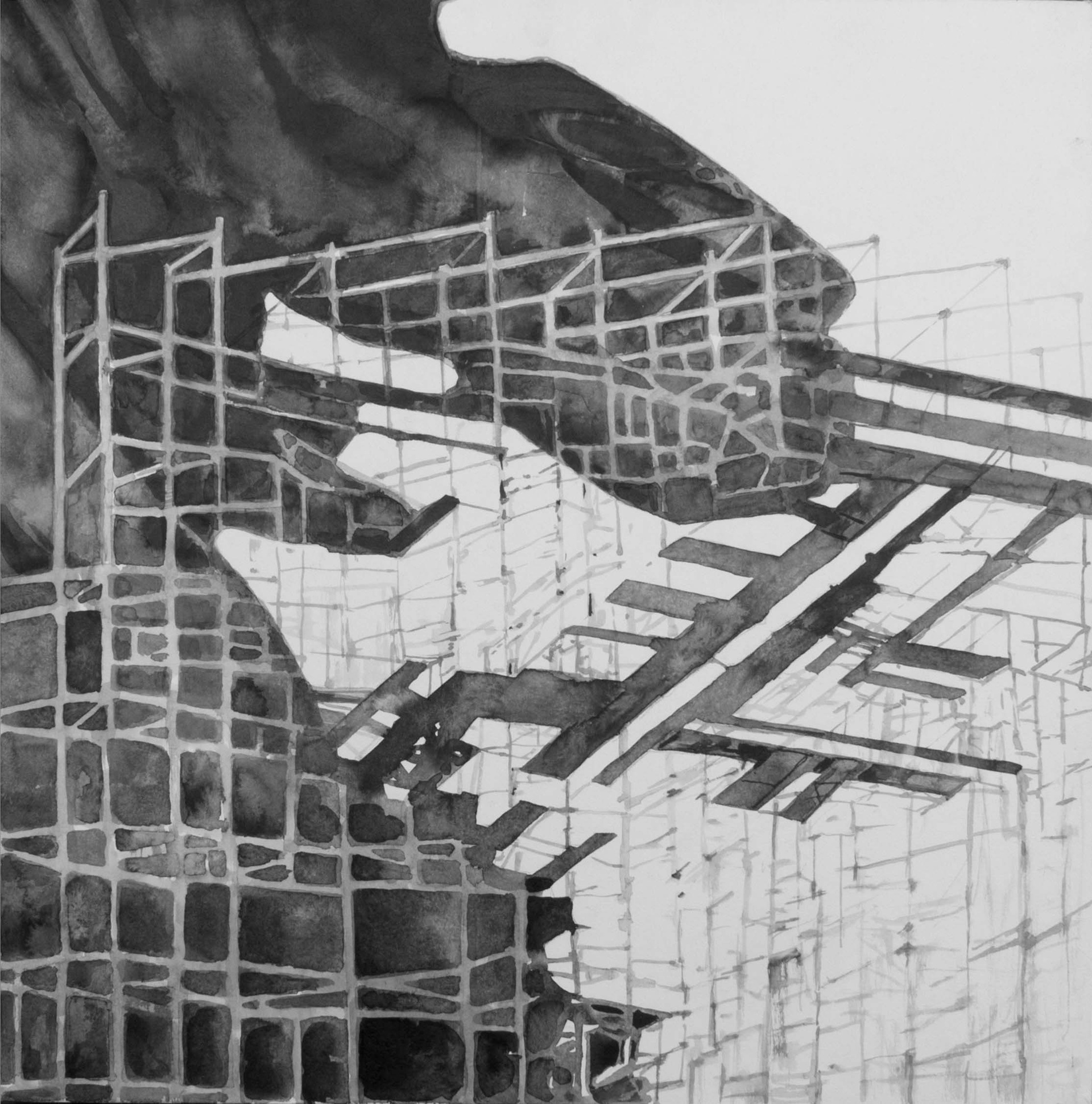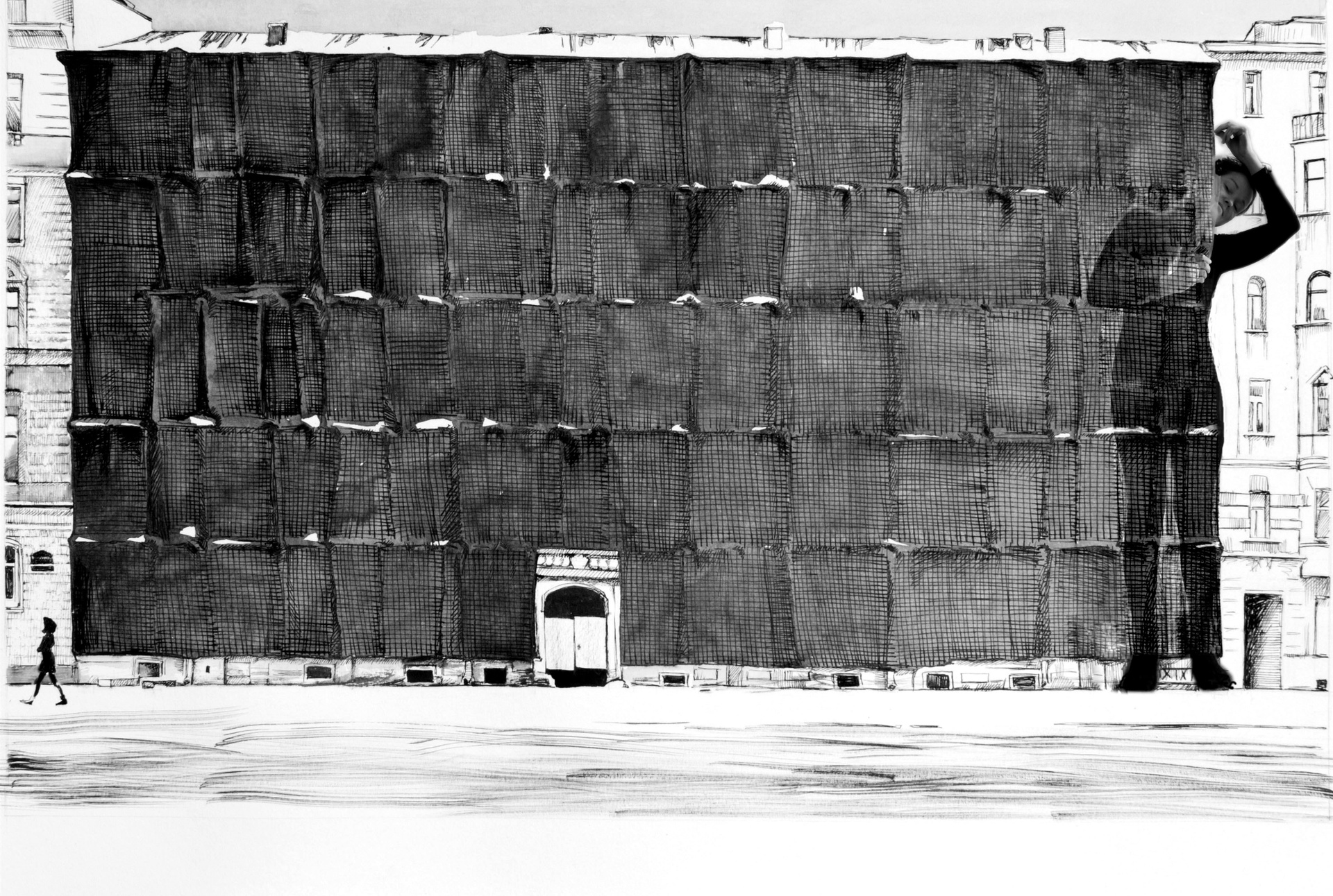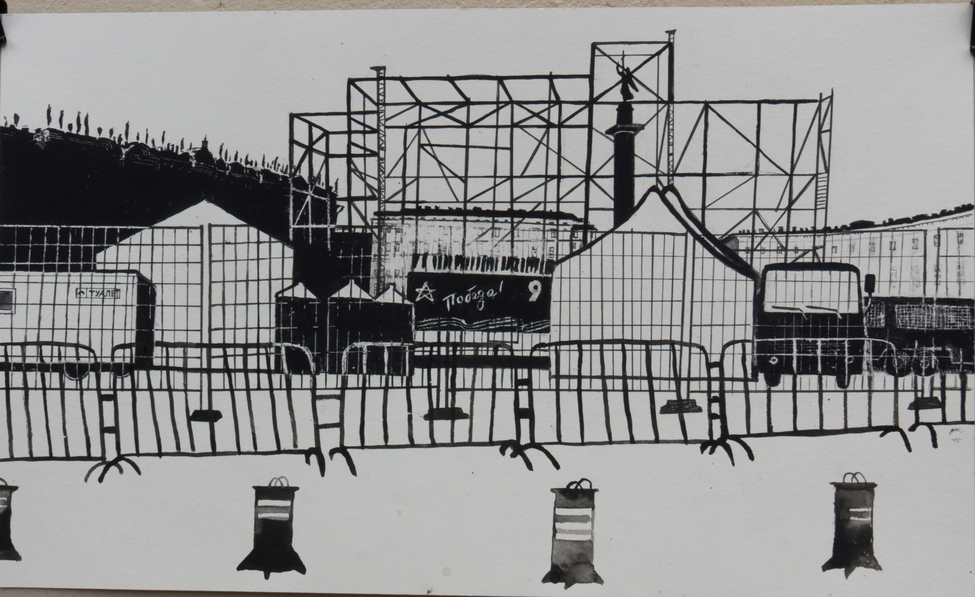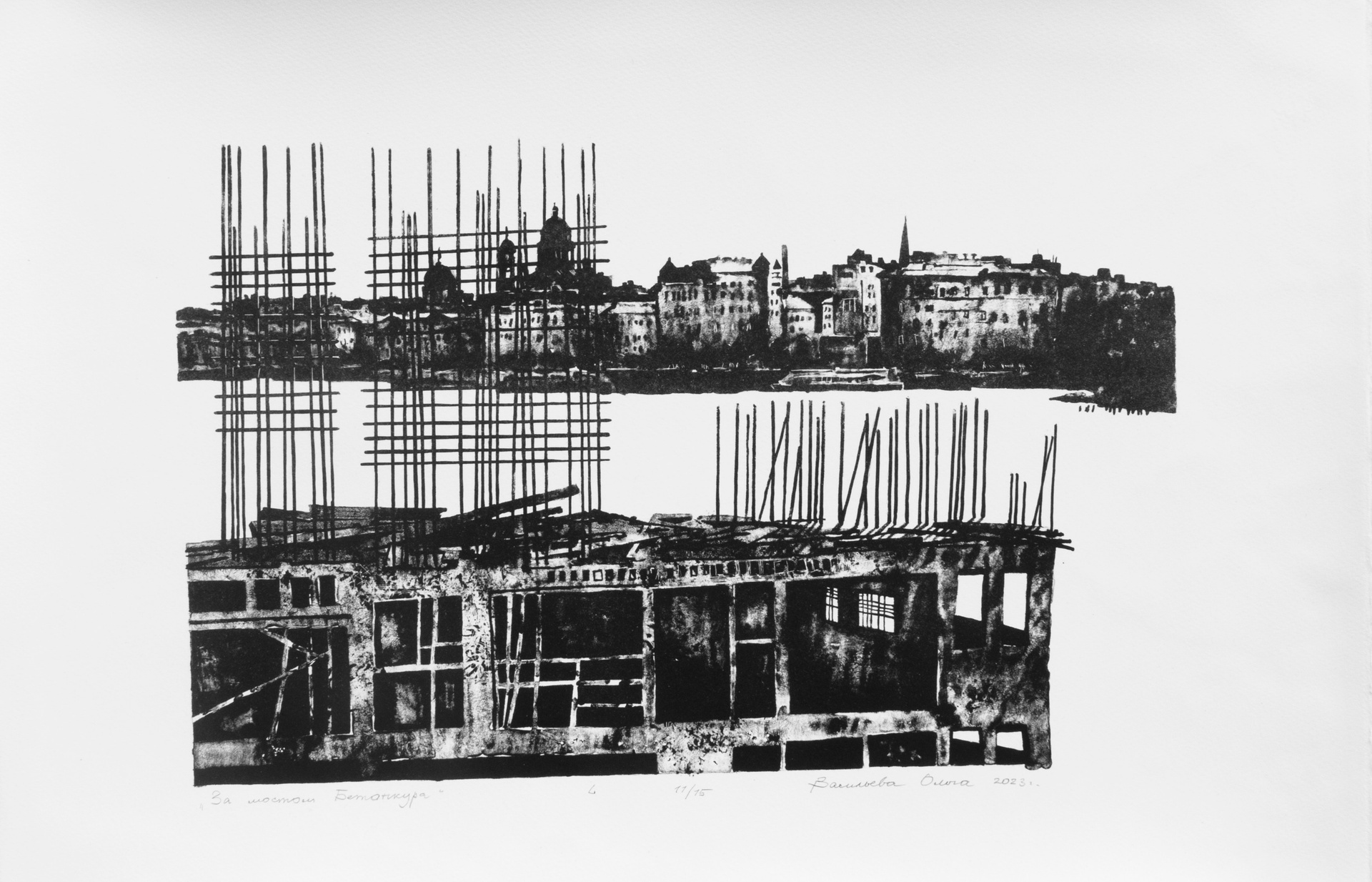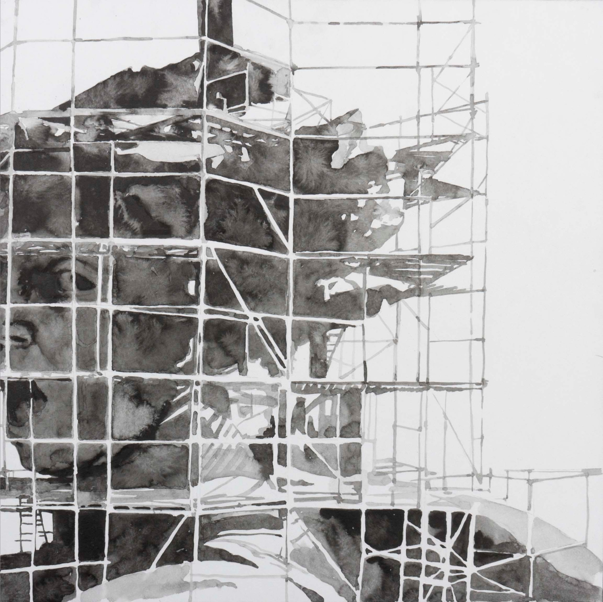 Временные конструкции — серия литографий, графических работ и видео, в которой исследуется, как в городской среде возникают и исчезают временные формы. Строительные леса, заборы, временные переходы и ограждения — объекты, мимо которых мы проходим, не задерживая взгляд. Они воспринимаются как визуальный шум, но именно в них фиксируются уязвимость города, его метаморфозы. Эти конструкции одновременно функциональны и случайны, они вмешиваются в привычный ландшафт, изменяют восприятие памятников, фасадов и пустых пространств.
