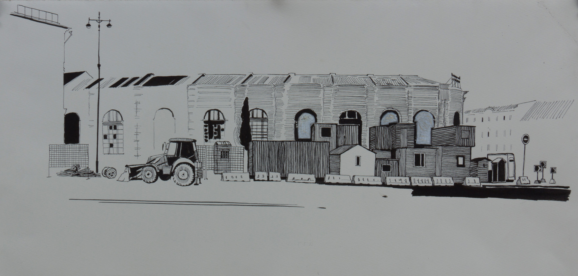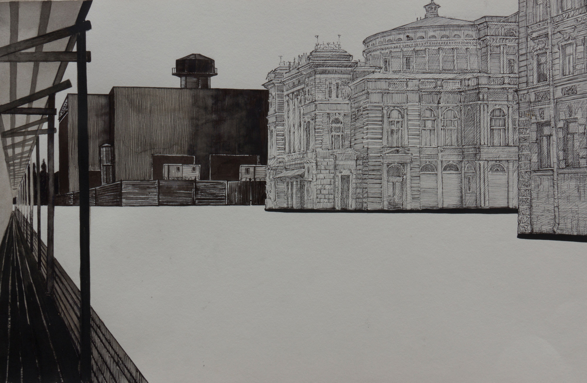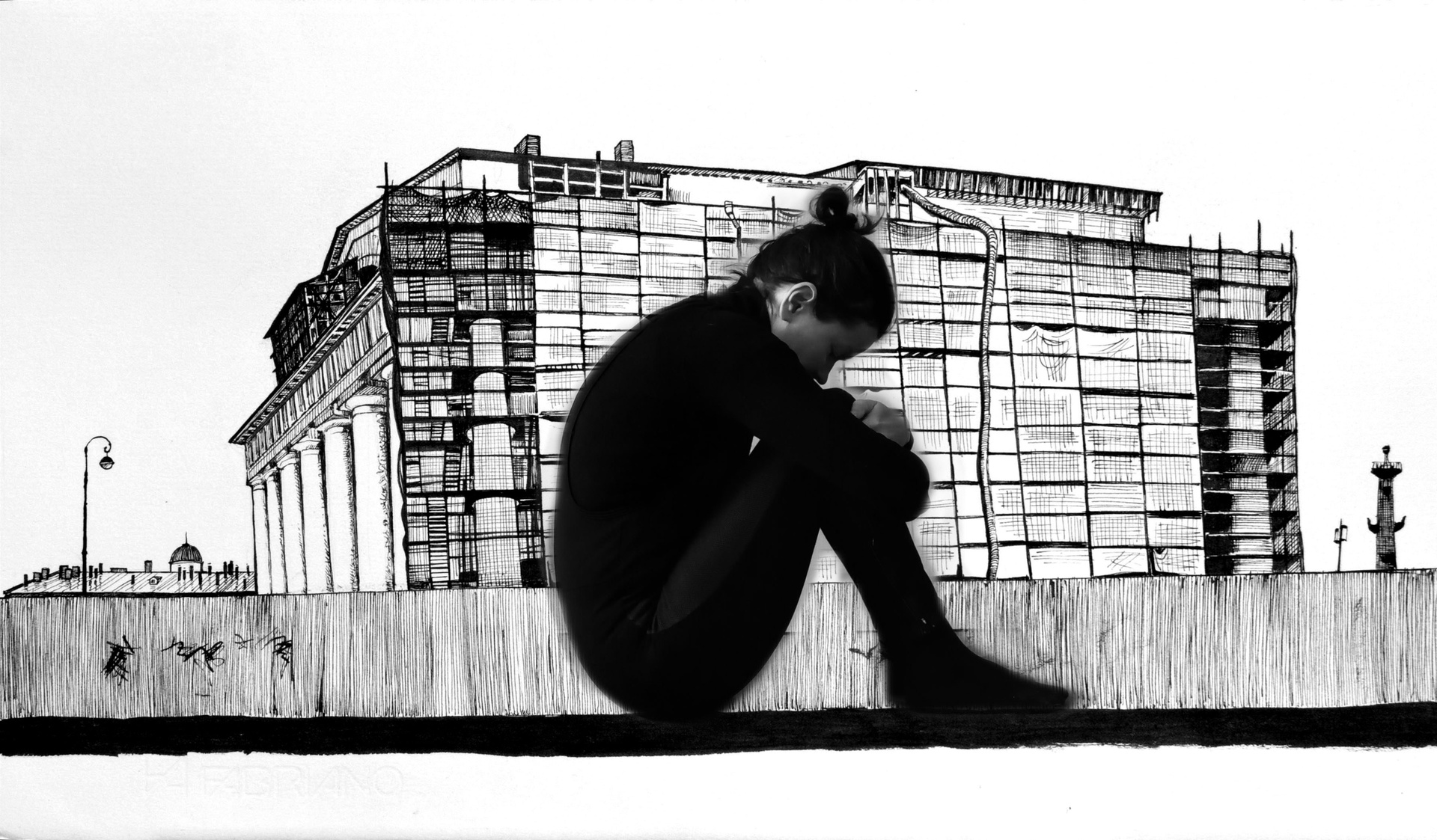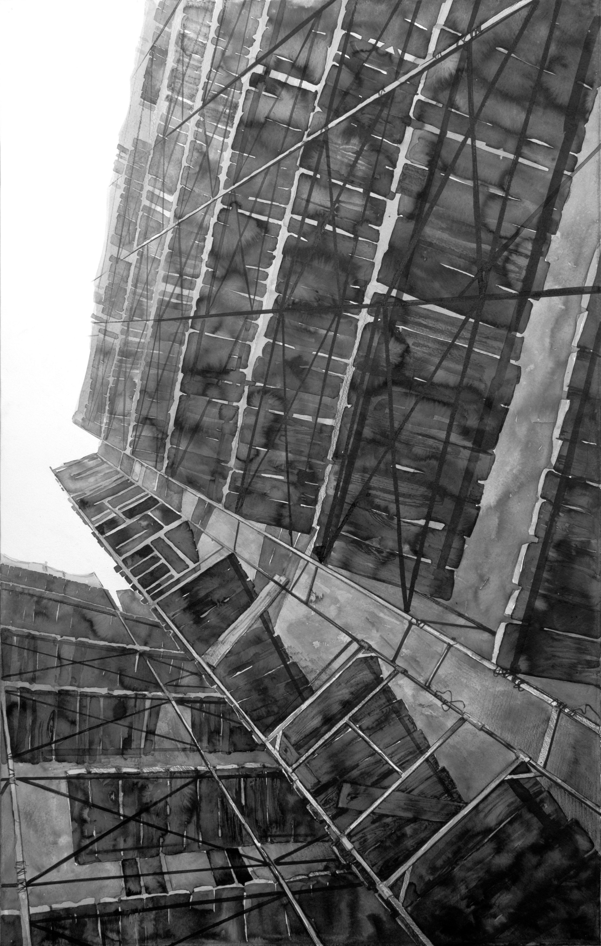 Временные конструкции — серия литографий, графических работ и видео, в которой исследуется, как в городской среде возникают и исчезают временные формы. Строительные леса, заборы, временные переходы и ограждения — объекты, мимо которых мы проходим, не задерживая взгляд. Они воспринимаются как визуальный шум, но именно в них фиксируются уязвимость города, его метаморфозы. Эти конструкции одновременно функциональны и случайны, они вмешиваются в привычный ландшафт, изменяют восприятие памятников, фасадов и пустых пространств.