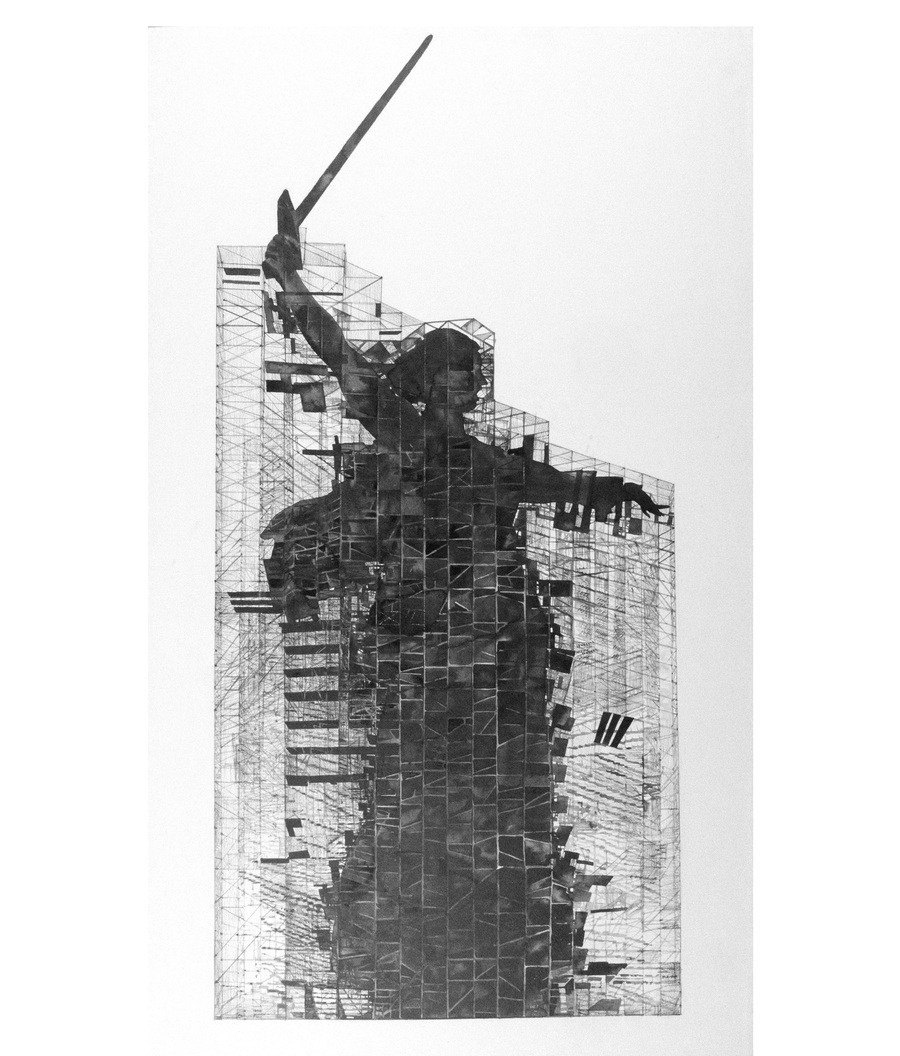 Посвящена образу монумента Родина-мать, скульптора Евгения Вучетича. Изображен период реставрации. Центральный лист — фронтальное изображение фигуры, полностью заключённой в строительные леса. По сторонам — фрагменты той же скульптуры: рука, голова, ткань плаща, разделённые на детали. Образ уже не читается как целое, он фрагментирован, почти абстрактен, словно проходит через вторичную деконструкцию. Это уже не просто разрушение — а абсурдные усилия сохранить. Серия работает на грани между историческим символом и визуальным шумом.