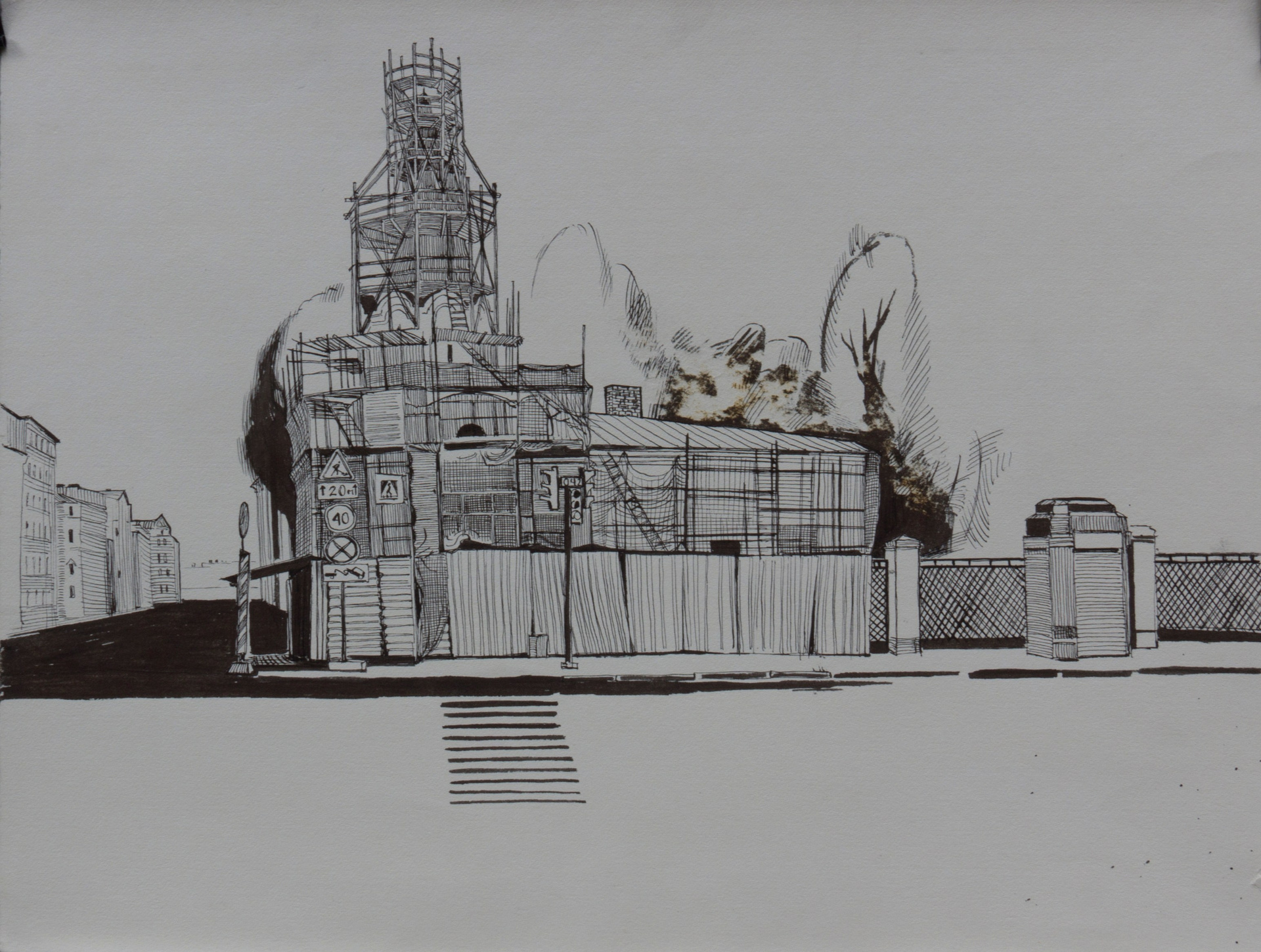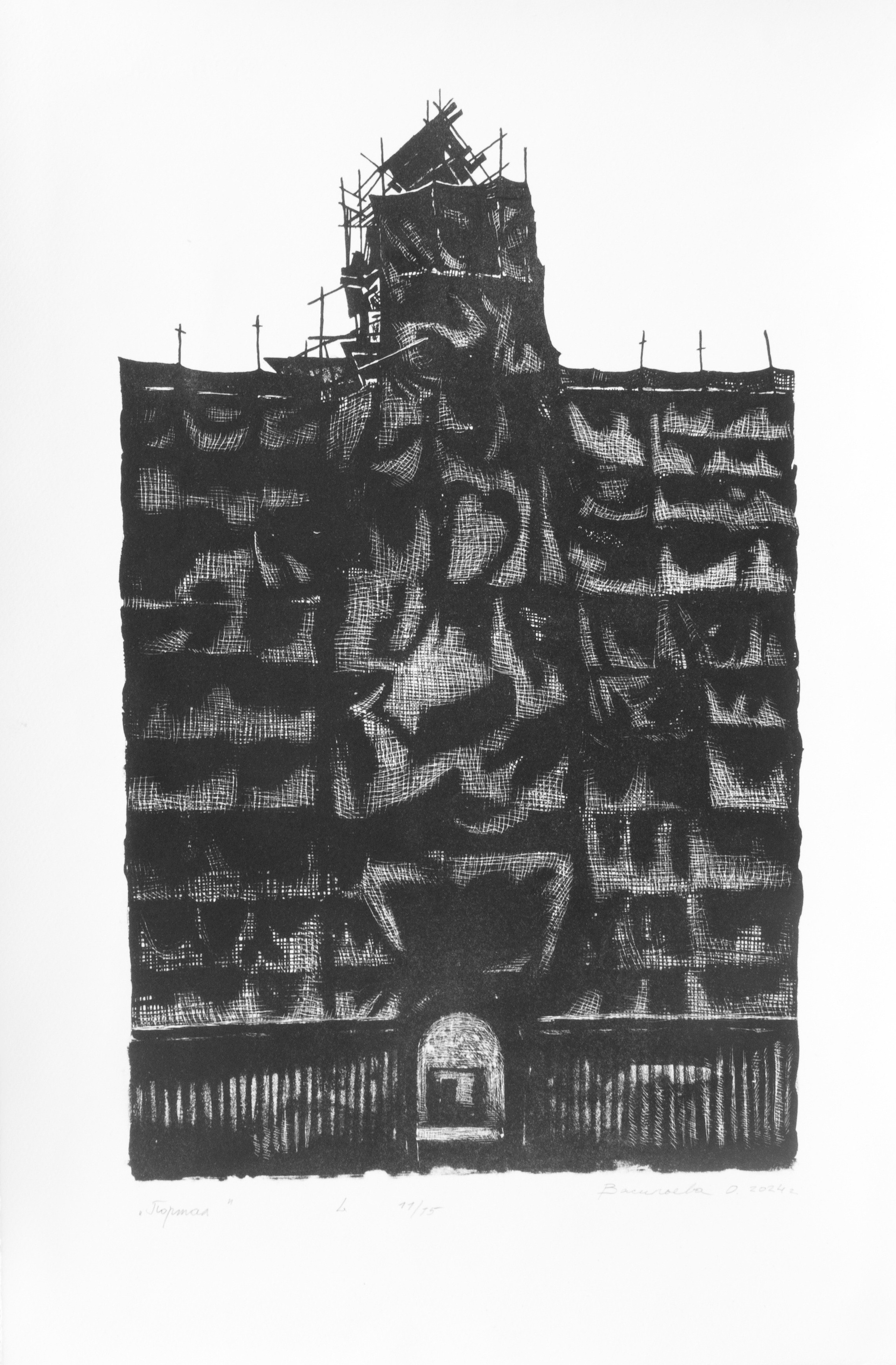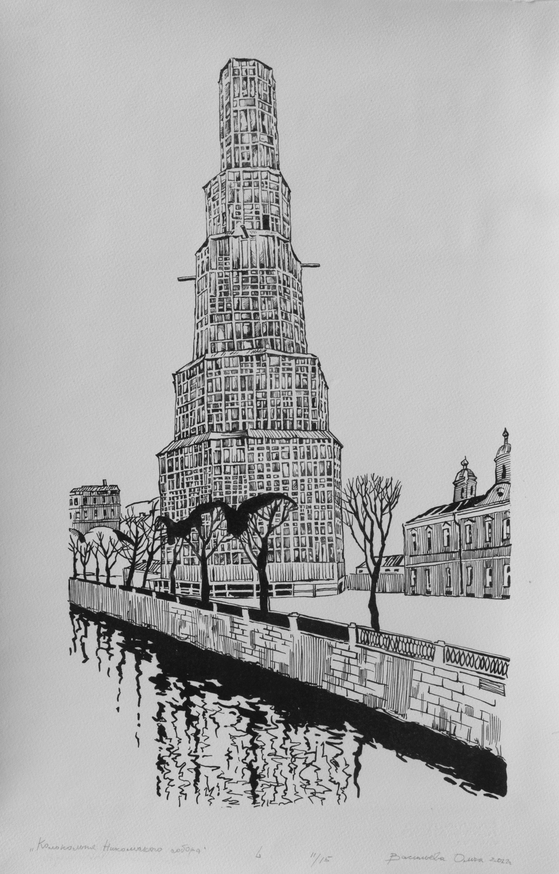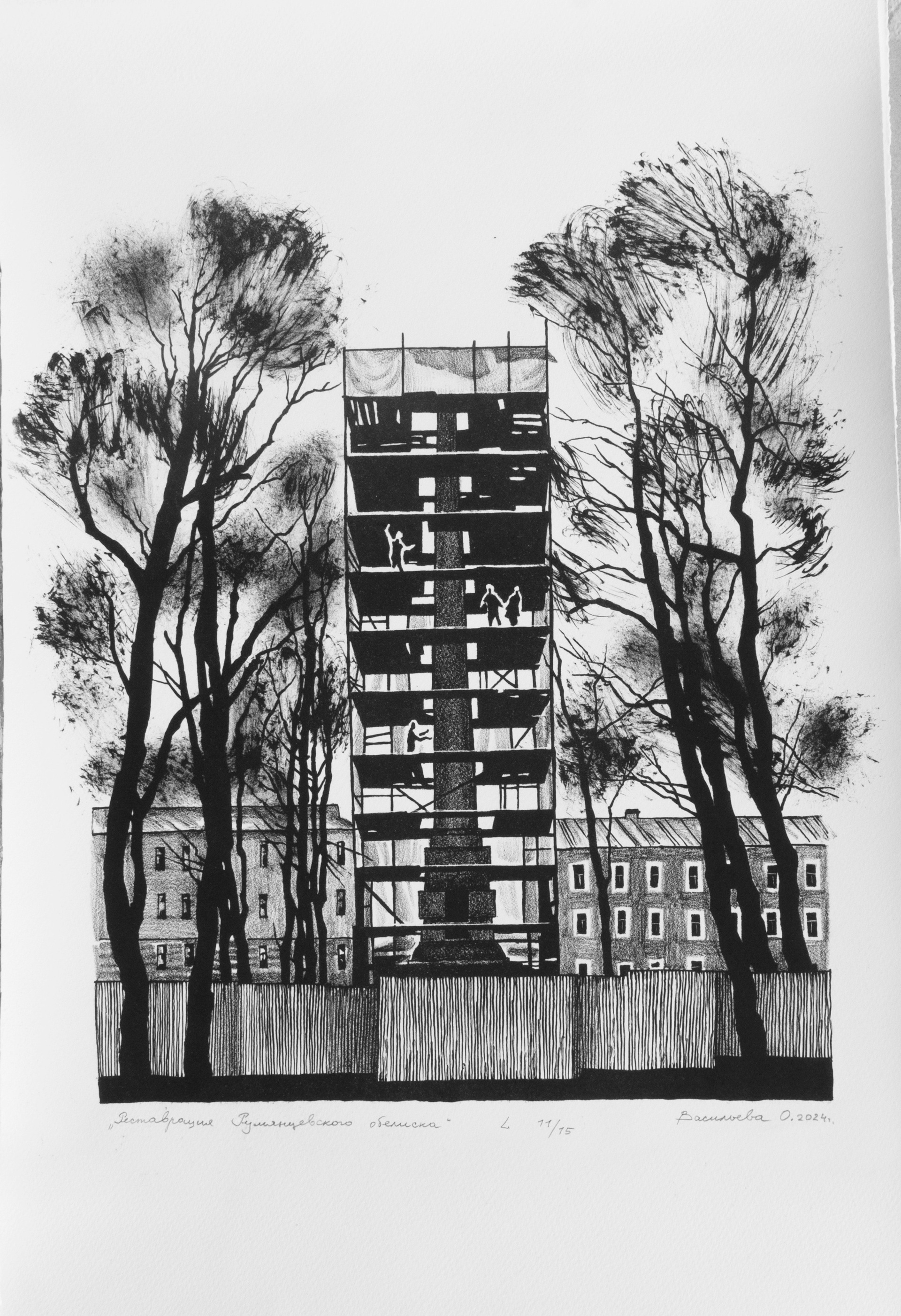 В этой серии возможность тиражирования в литографии использована не для печати одинаковых изображений, а как прием для передачи изменений объекта. На одной печатной форме была нарисована колокольня Никольского собора, а на другой — строительные леса, возведённые для реставрации колокольни. Печать происходила с последовательным уничтожением рисунка на печатной форме. Каждый оттиск фиксирует одно из состояний формы. Наложение двух рисунков дало возможность показать появление одного объекта и исчезновение другого.