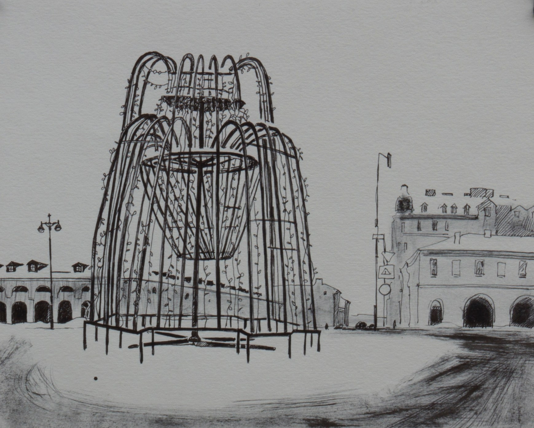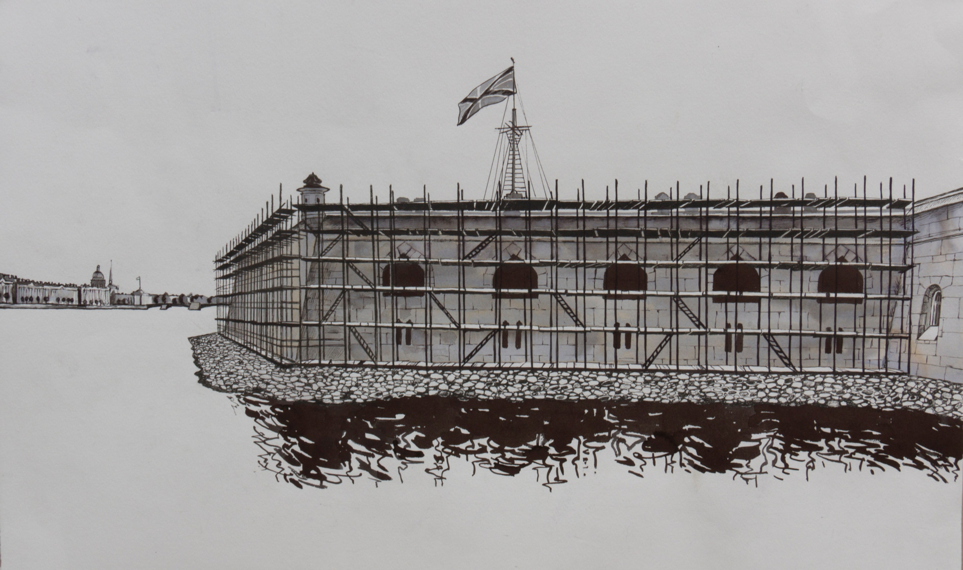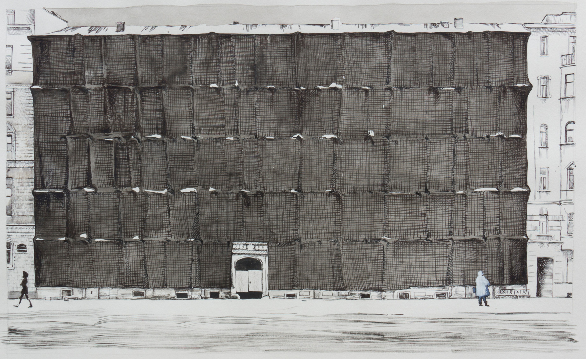 В этой серии возможность тиражирования в литографии использована не для печати одинаковых изображений, а как прием для передачи изменений объекта. На одной печатной форме была нарисована колокольня Никольского собора, а на другой — строительные леса, возведённые для реставрации колокольни. Печать происходила с последовательным уничтожением рисунка на печатной форме. Каждый оттиск фиксирует одно из состояний формы. Наложение двух рисунков дало возможность показать появление одного объекта и исчезновение другого.
