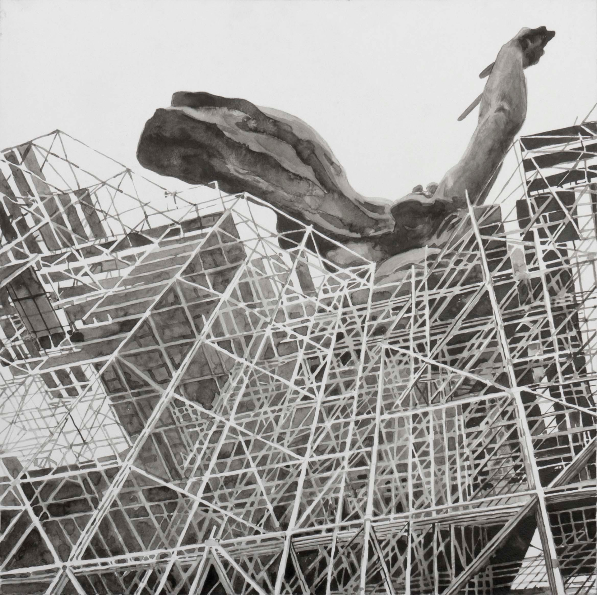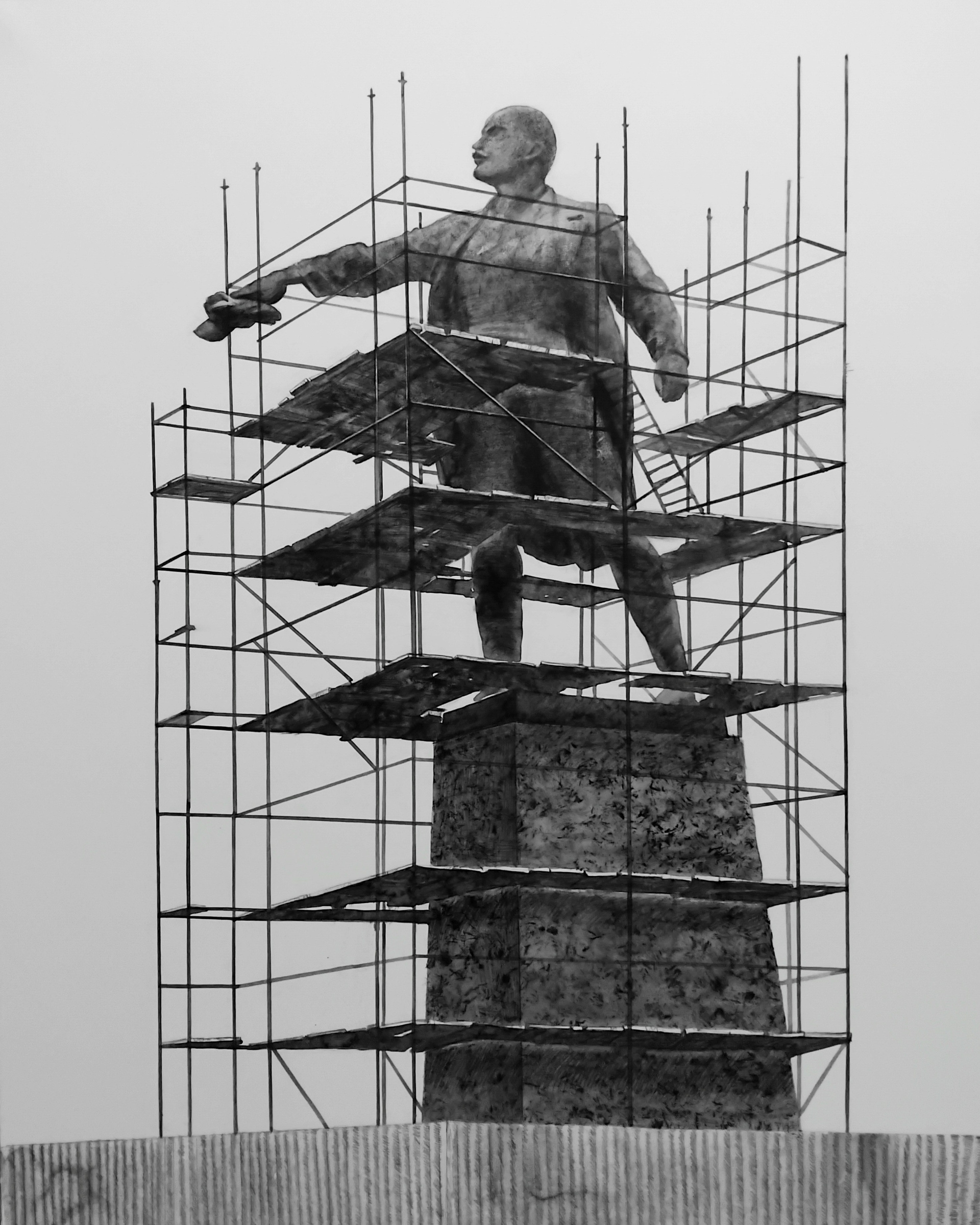 Работа из проекта Временные конструкции, в которой фиксируется момент, когда монумент находится в состоянии реставрации. Скульптура В. И. Ленина работы Михаила Аникушина, привычно читаемая как устойчивая и завершённая форма, здесь оказывается заключённой в временный каркас строительных лесов.
