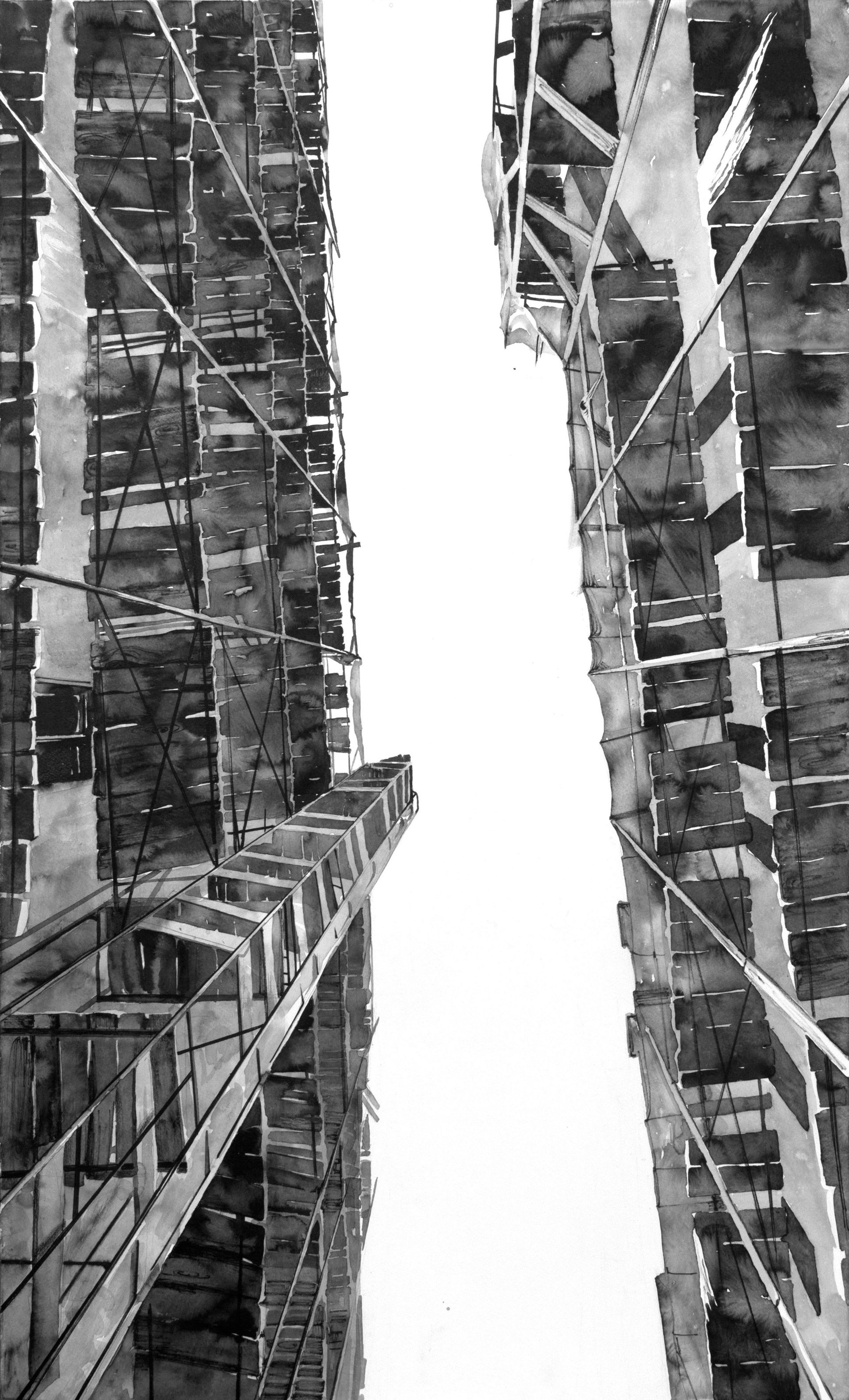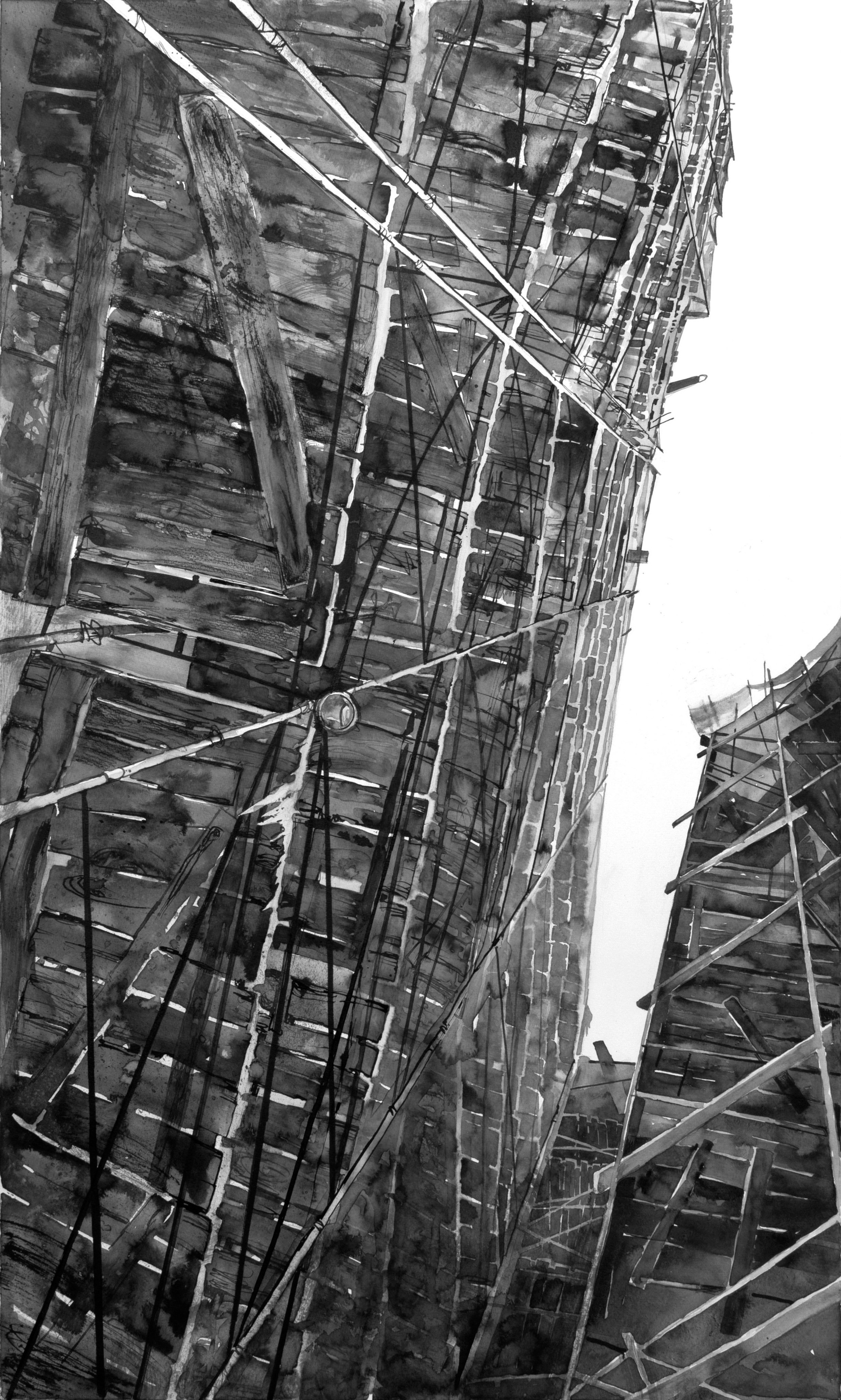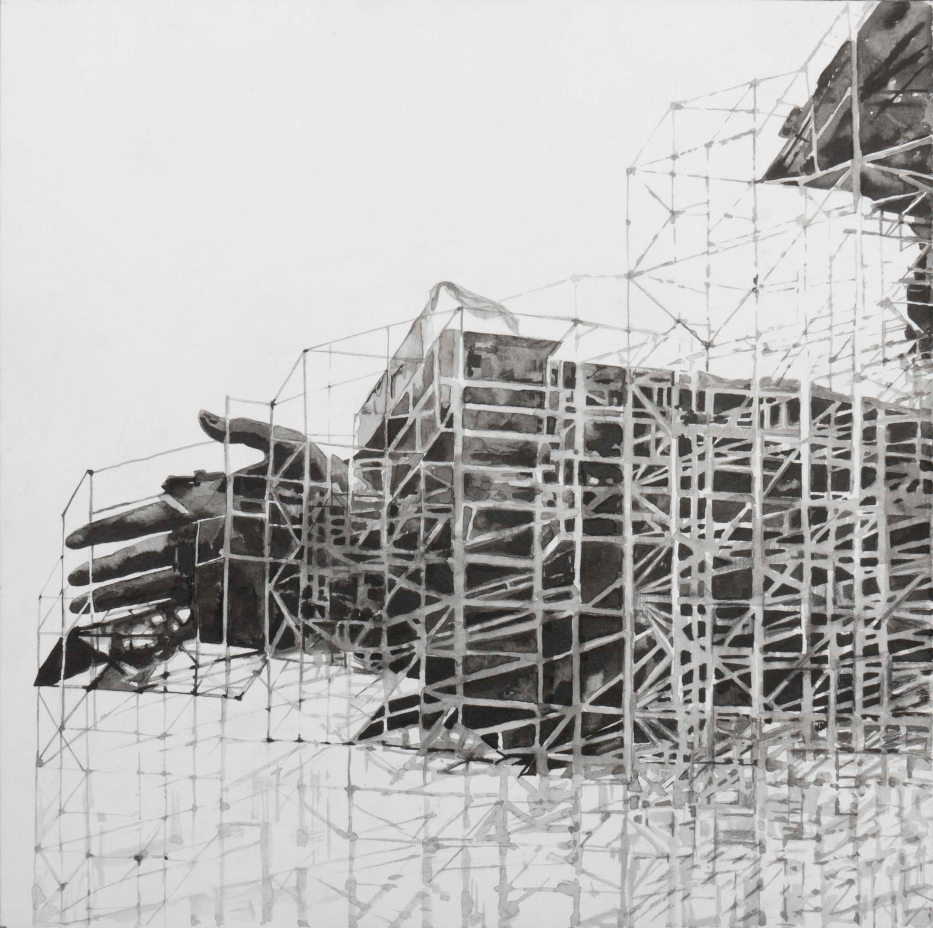 Работы сделаны во время ремонта дома, в котором находится моя мастерская. Строительные леса, натянутые сети и балки стали новой рамой неба при взгляде наверх из двора-колодца. Триптих стал попыткой поймать баланс между конструкцией и пустотой. Реальные опоры превращаются в абстрактный ритм линий, где временная архитектура становится самостоятельным образом.
